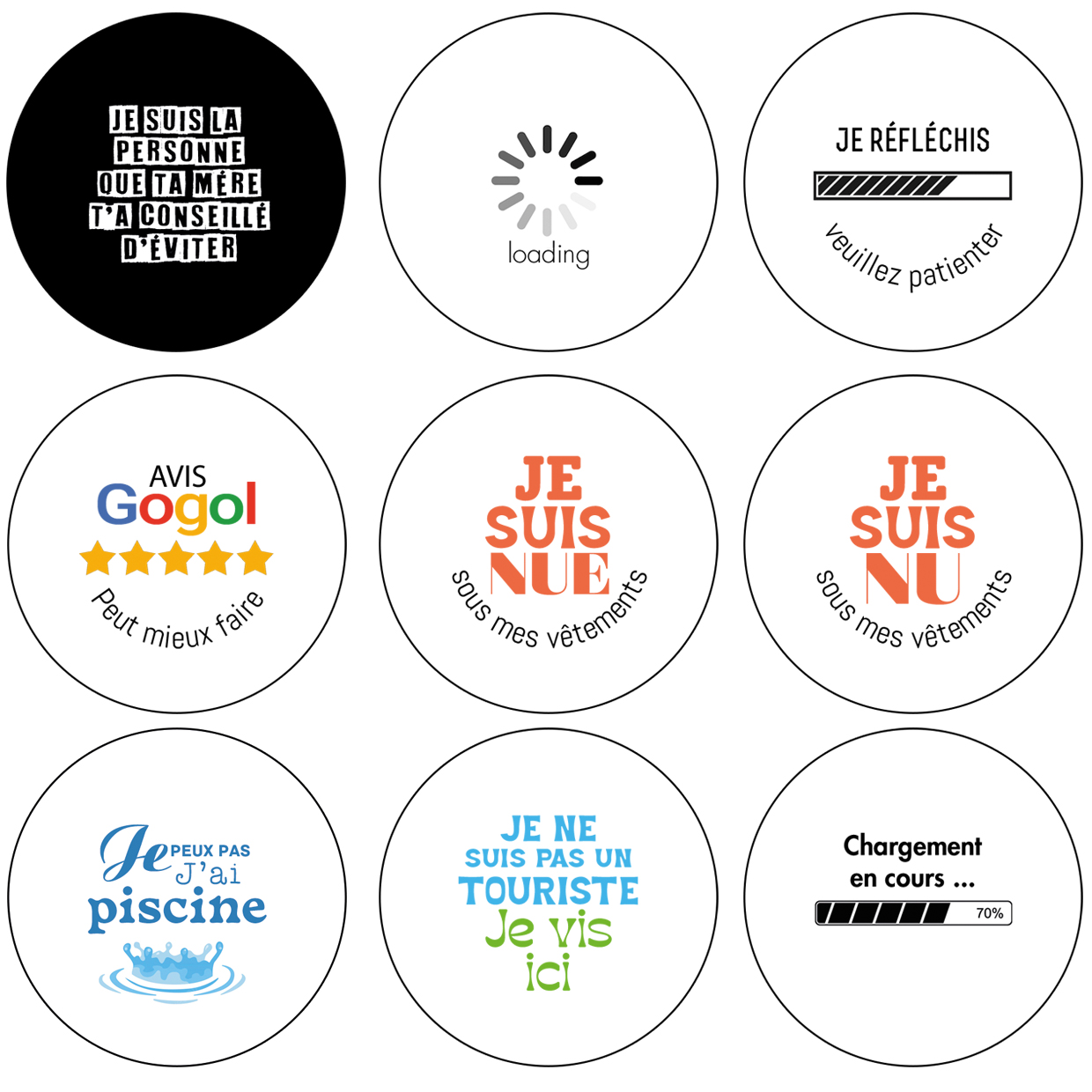 Je suis la personne que ta mère…, Loading, Je réfléchis, veuillez patienter, Avis Gogol…, Je suis nue…, Je suis nu…, J'peux pas, j'ai piscine, Je suis pas un touriste…, Chargement en cours, Allez tous vous faire
