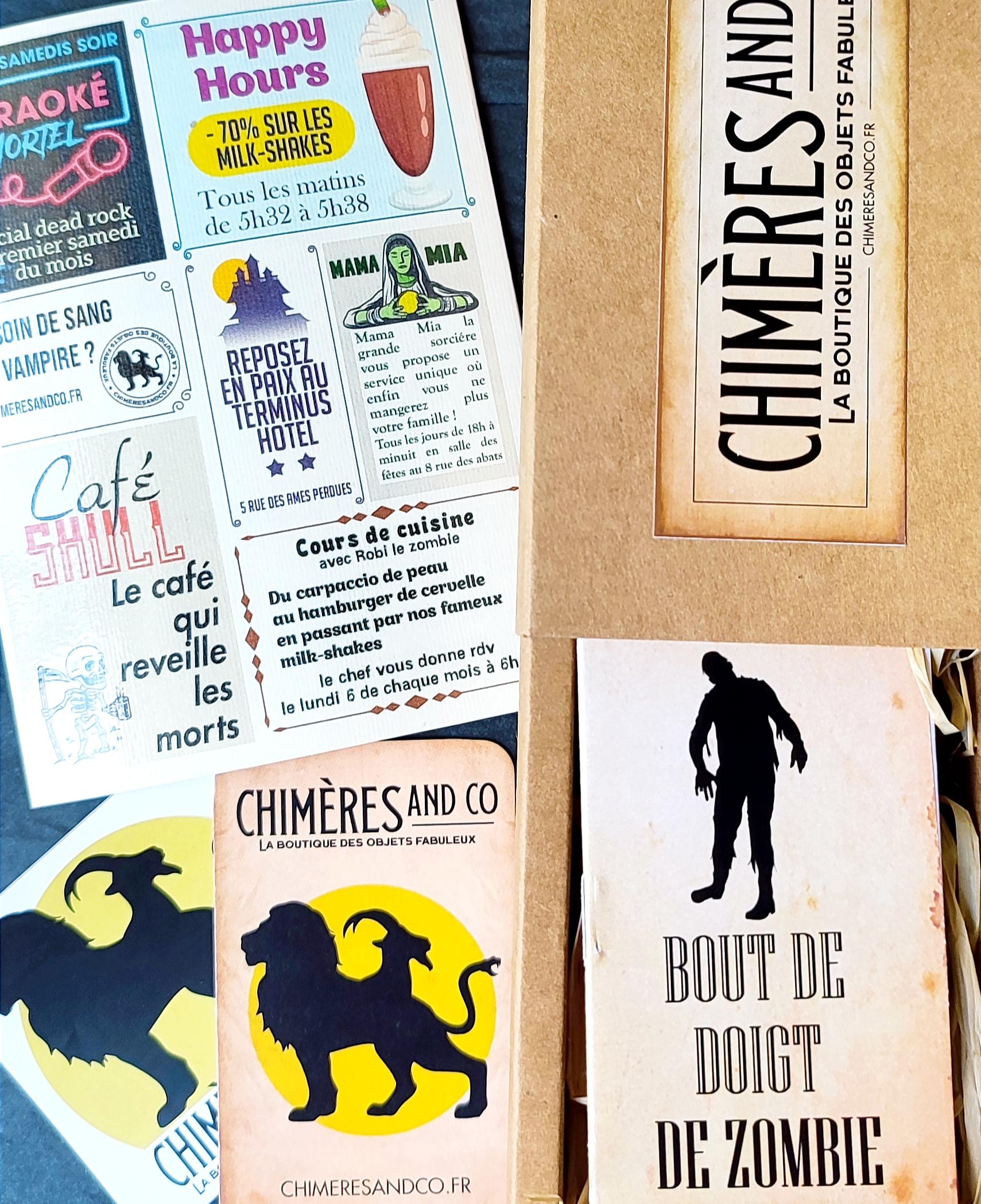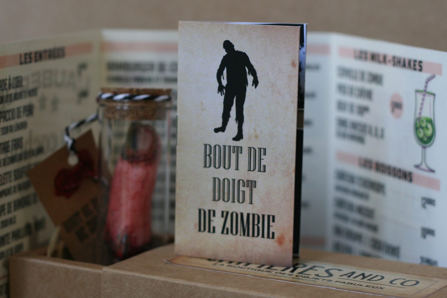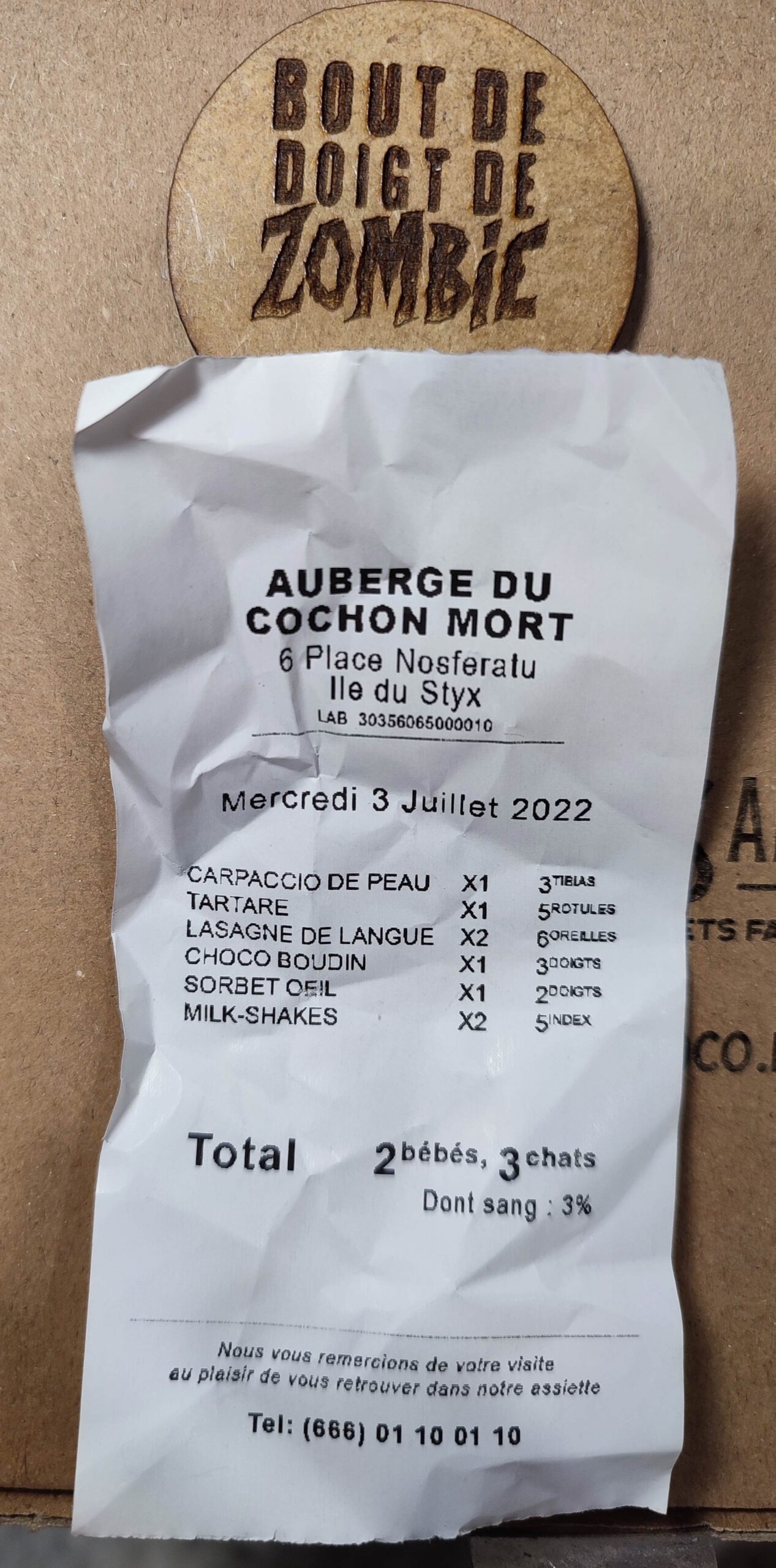 Mais ce n’est pas tout ! Le bout de doigt est présenté dans une boite kraft remplie de raphia, avec une carte de restaurant et son ticket de caisse complètement farfelu.