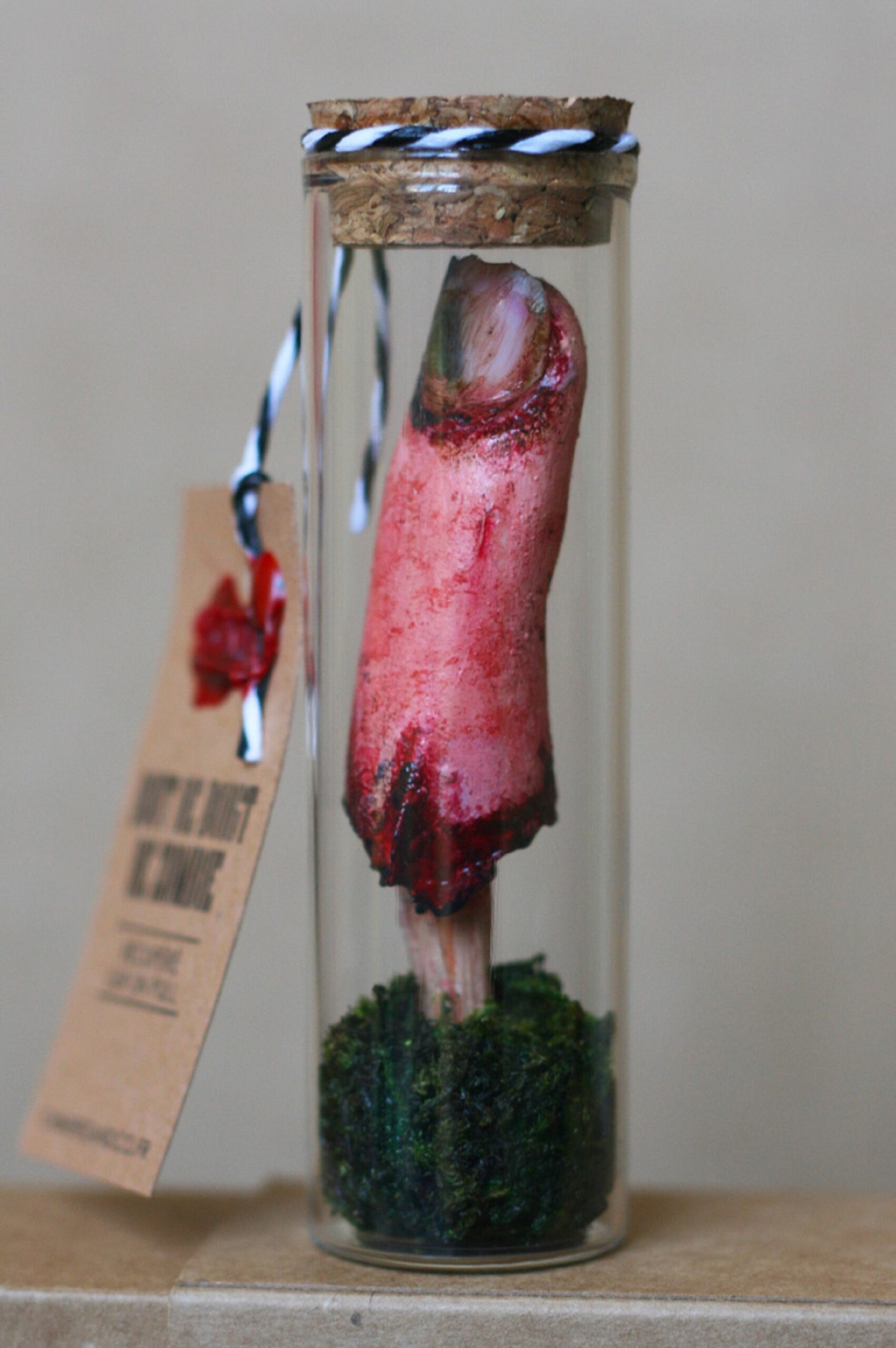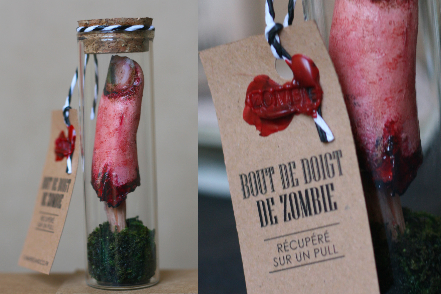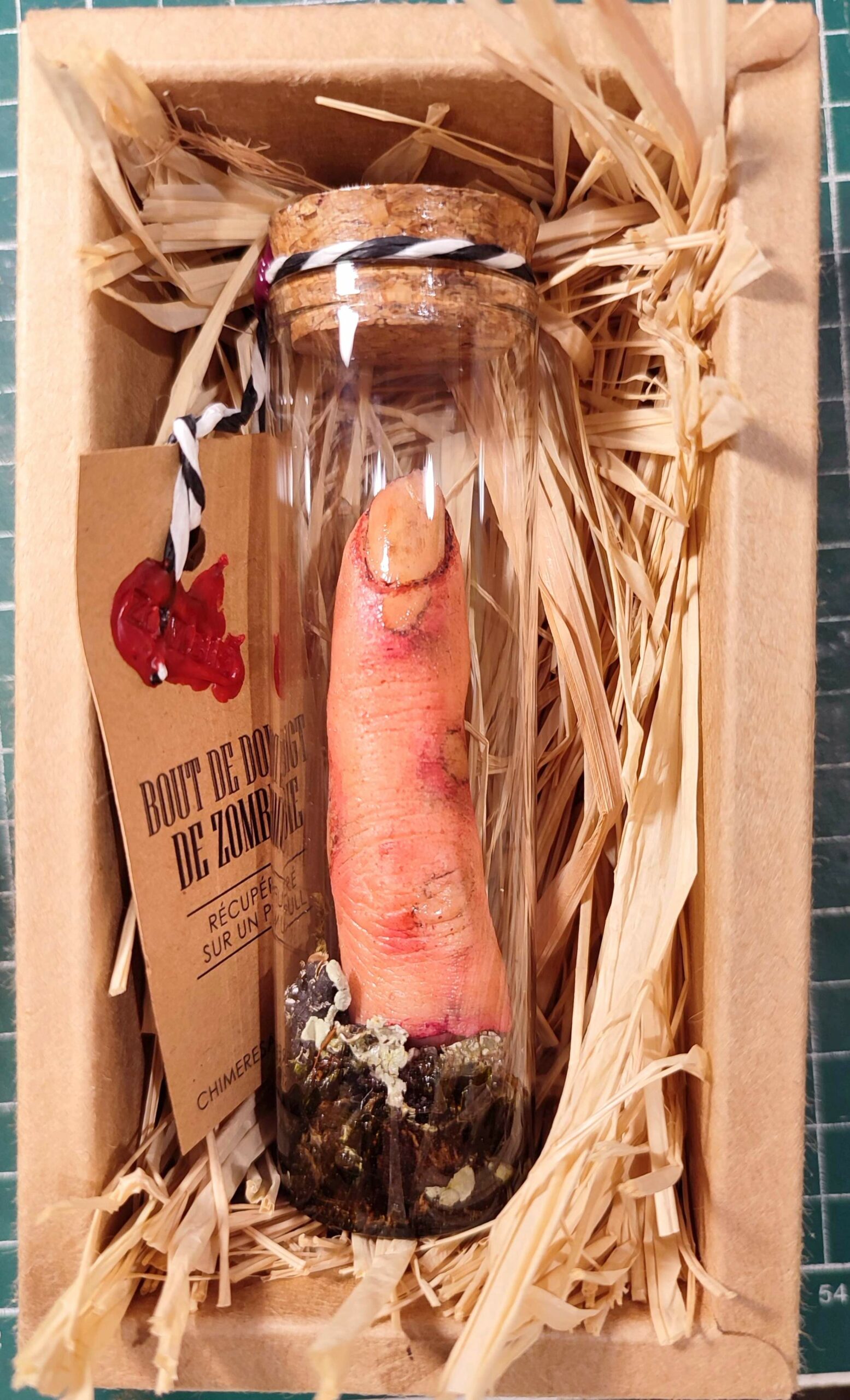Ce bout de doigt, récupéré sur un pull, est présenté dans une fiole en verre avec bouchon en liège, scellée à la cire Herbin. Il est accompagné d’un livret explicatif détaillé sur la provenance et l’origine du contenu.