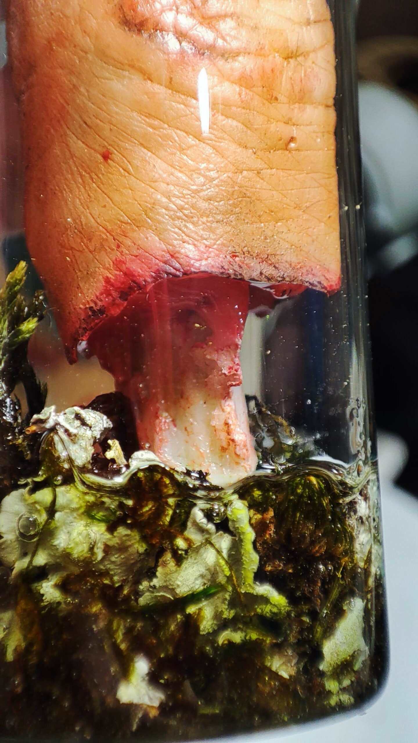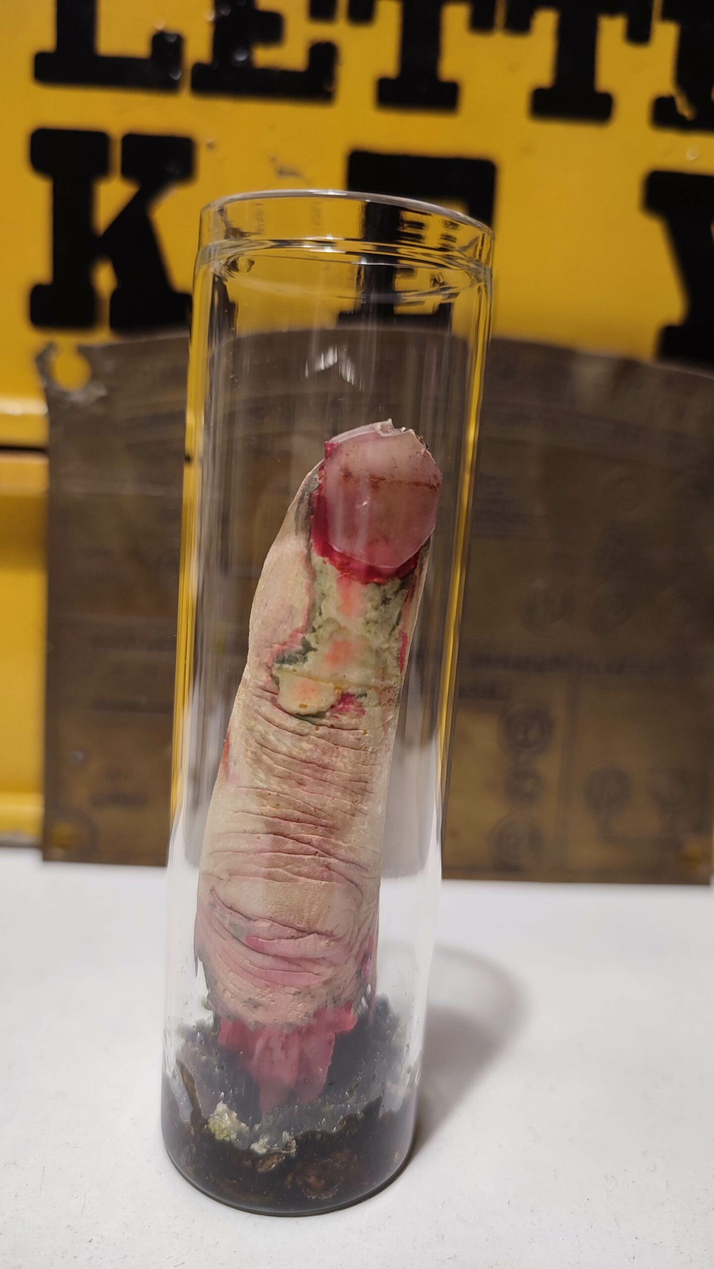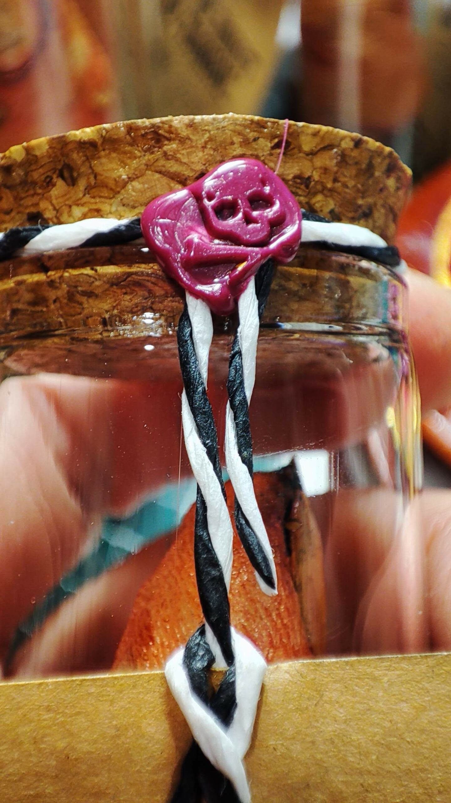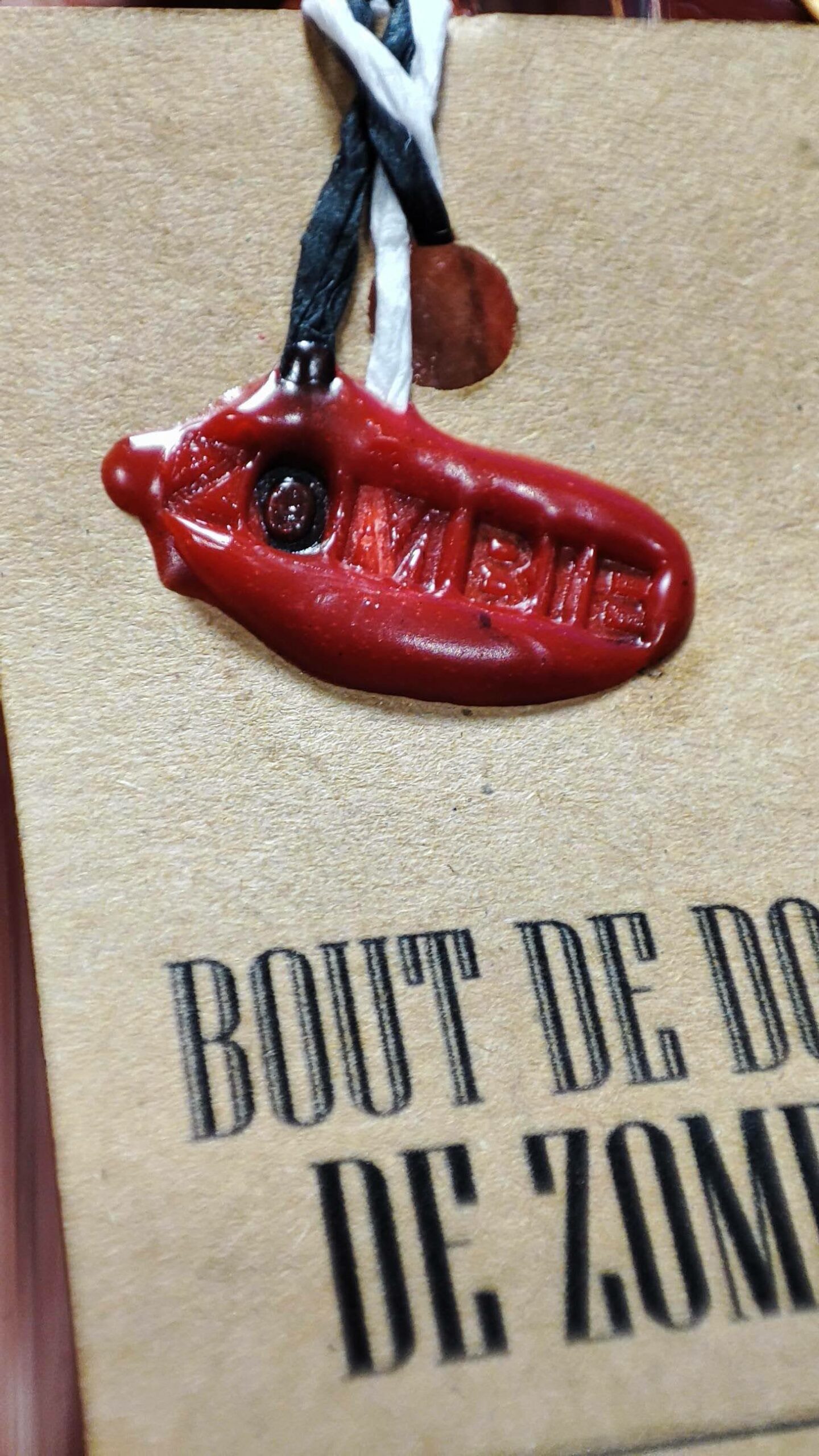 Ce bout de doigt, récupéré sur un pull, est présenté dans une fiole en verre avec bouchon en liège, scellée à la cire Herbin. Il est accompagné d’un livret explicatif détaillé sur la provenance et l’origine du contenu.