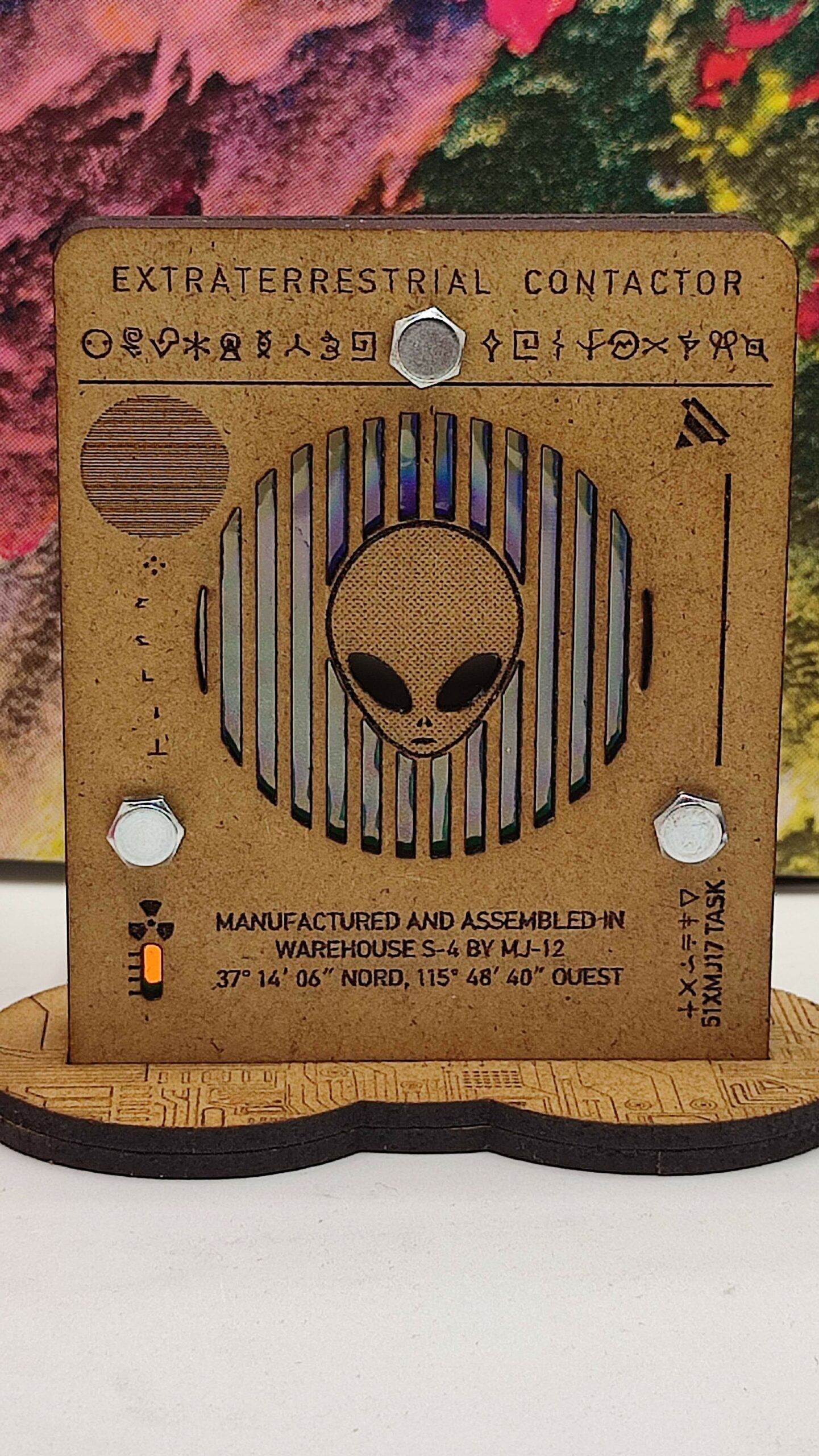 Objet sur socle en bois finement gravé de symboles du crash de Roswell