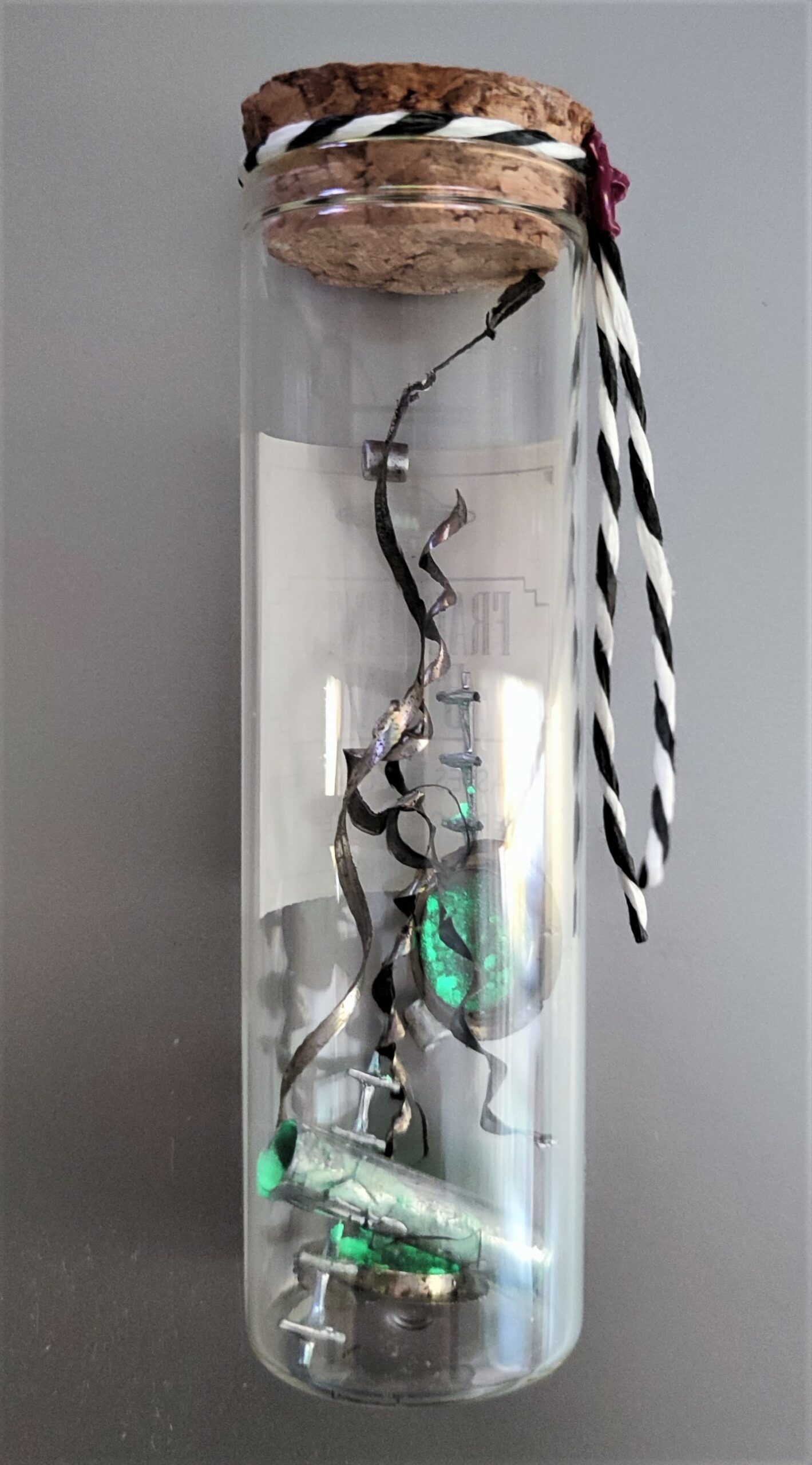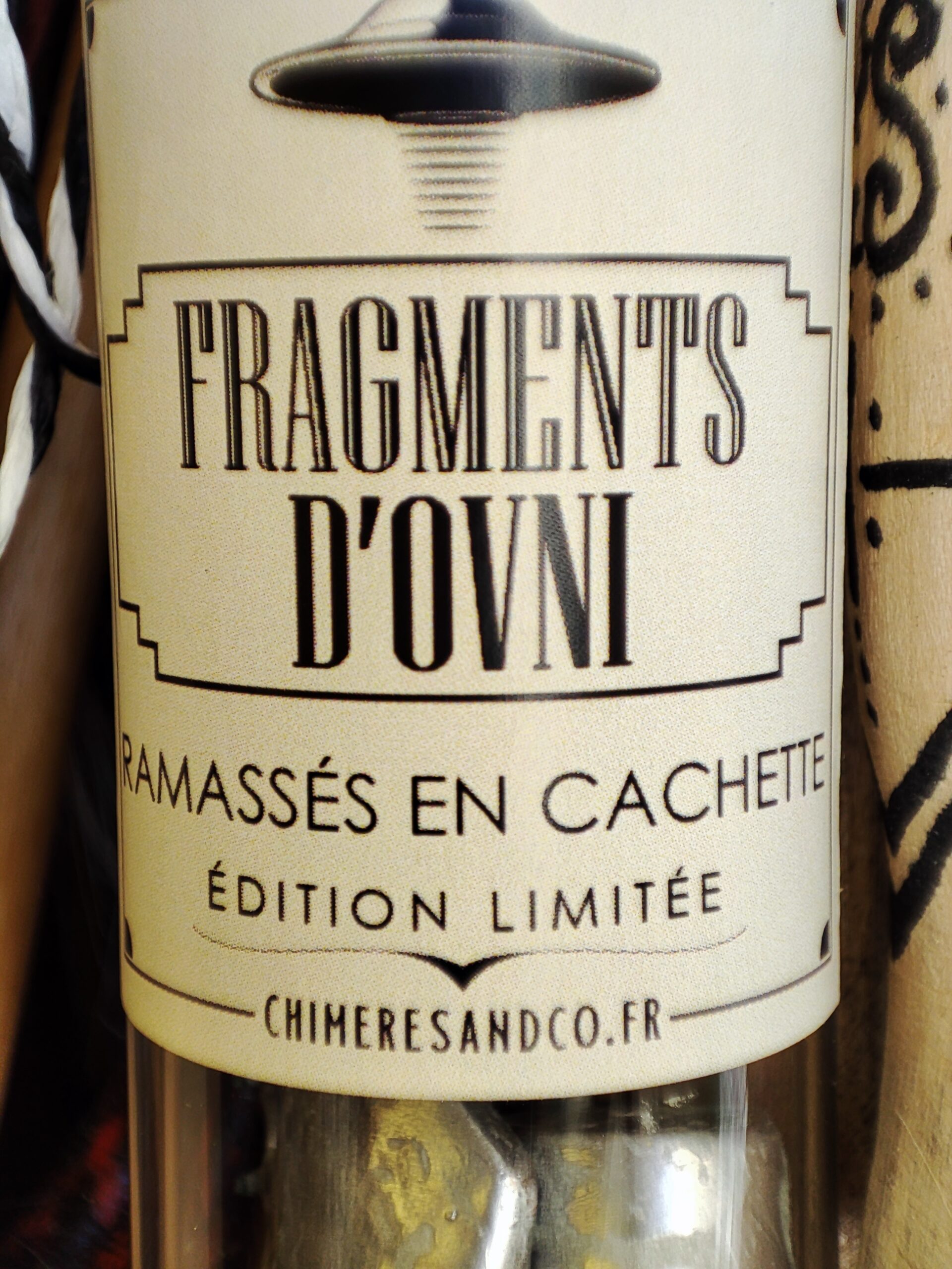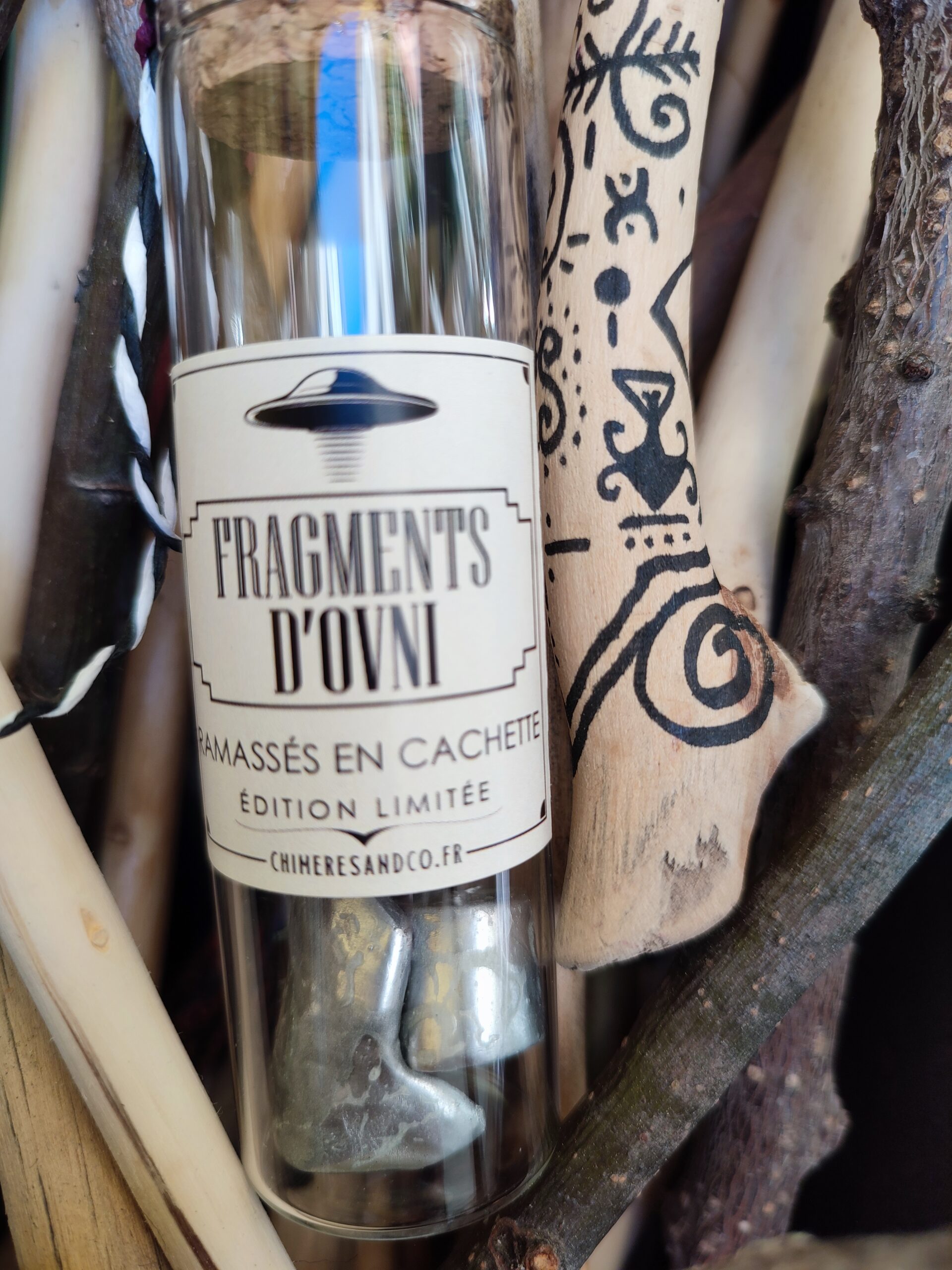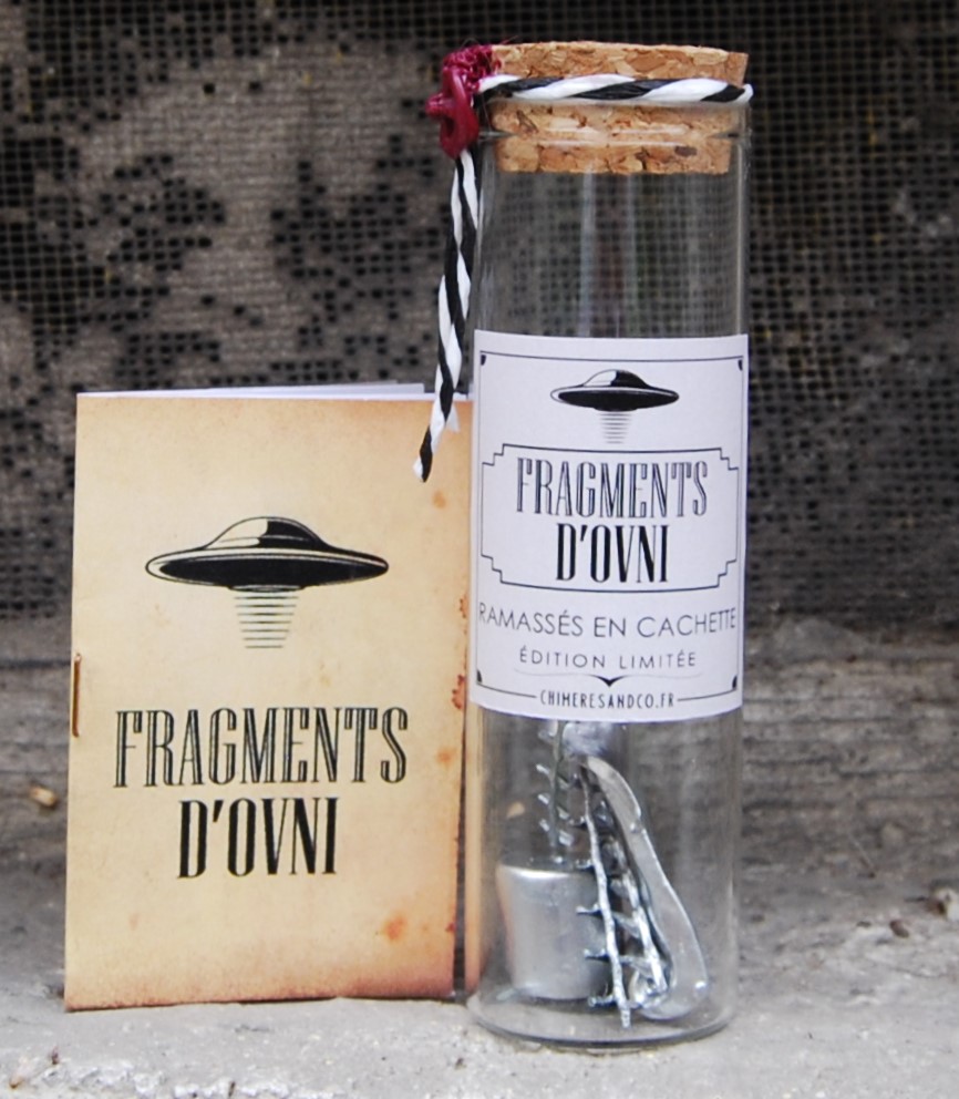 Nos fragments d’ovni sont présentés dans une fiole en verre avec bouchon en liège, scellée à la cire Herbin, accompagnés de son livret explicatif détaillé sur la provenance et l’origine du contenu et présentés dans une boite kraft remplie de raphia.