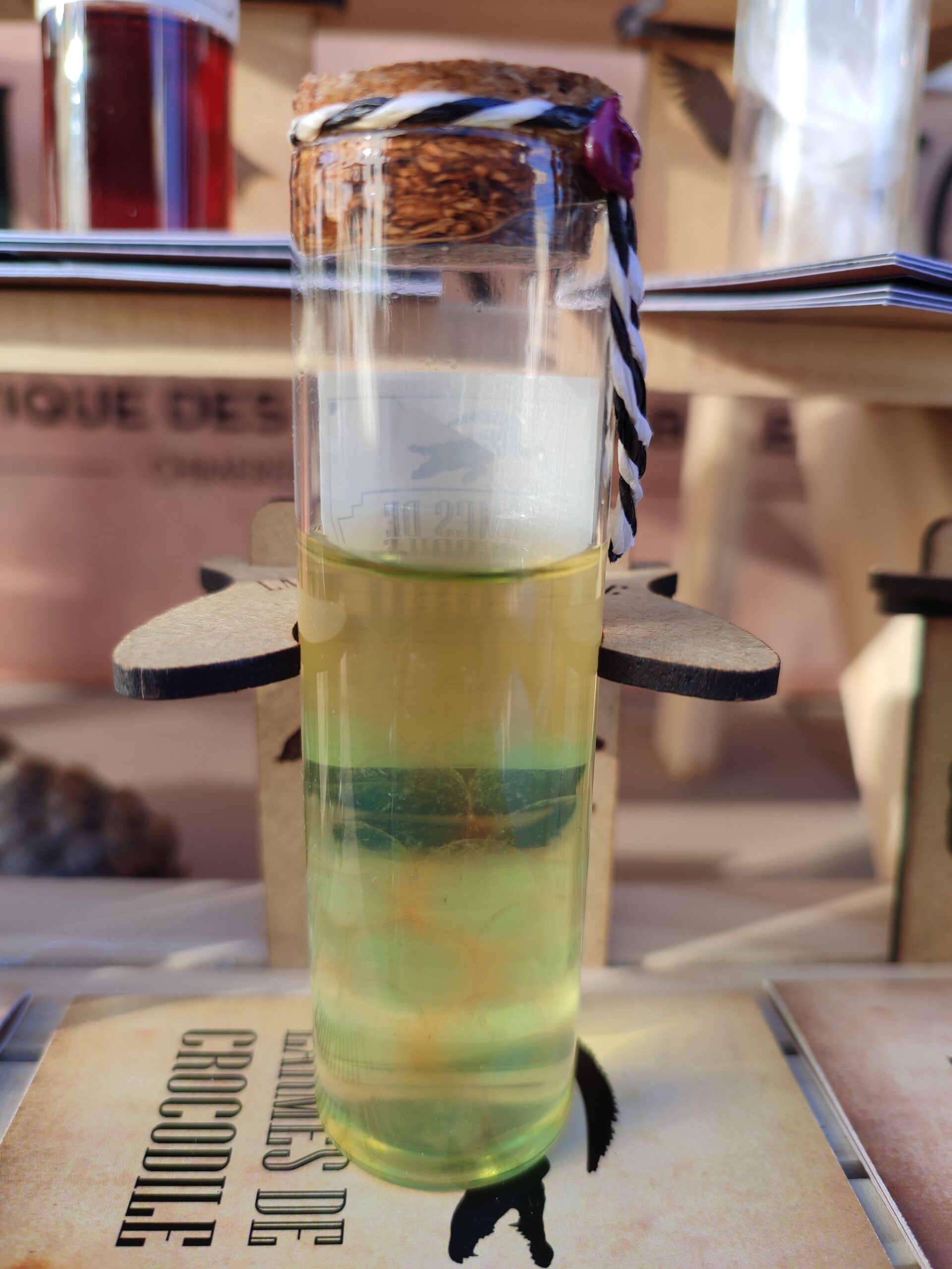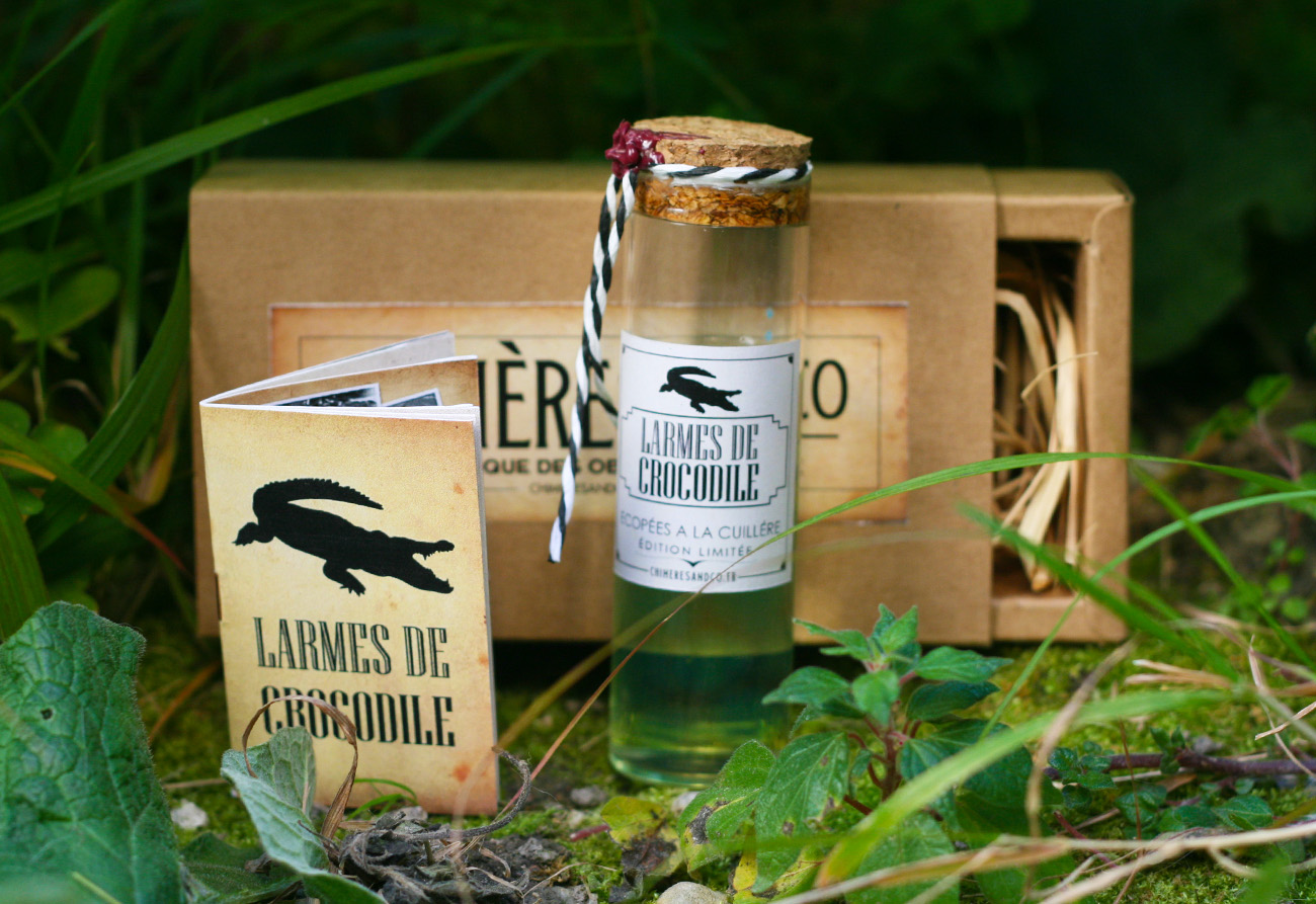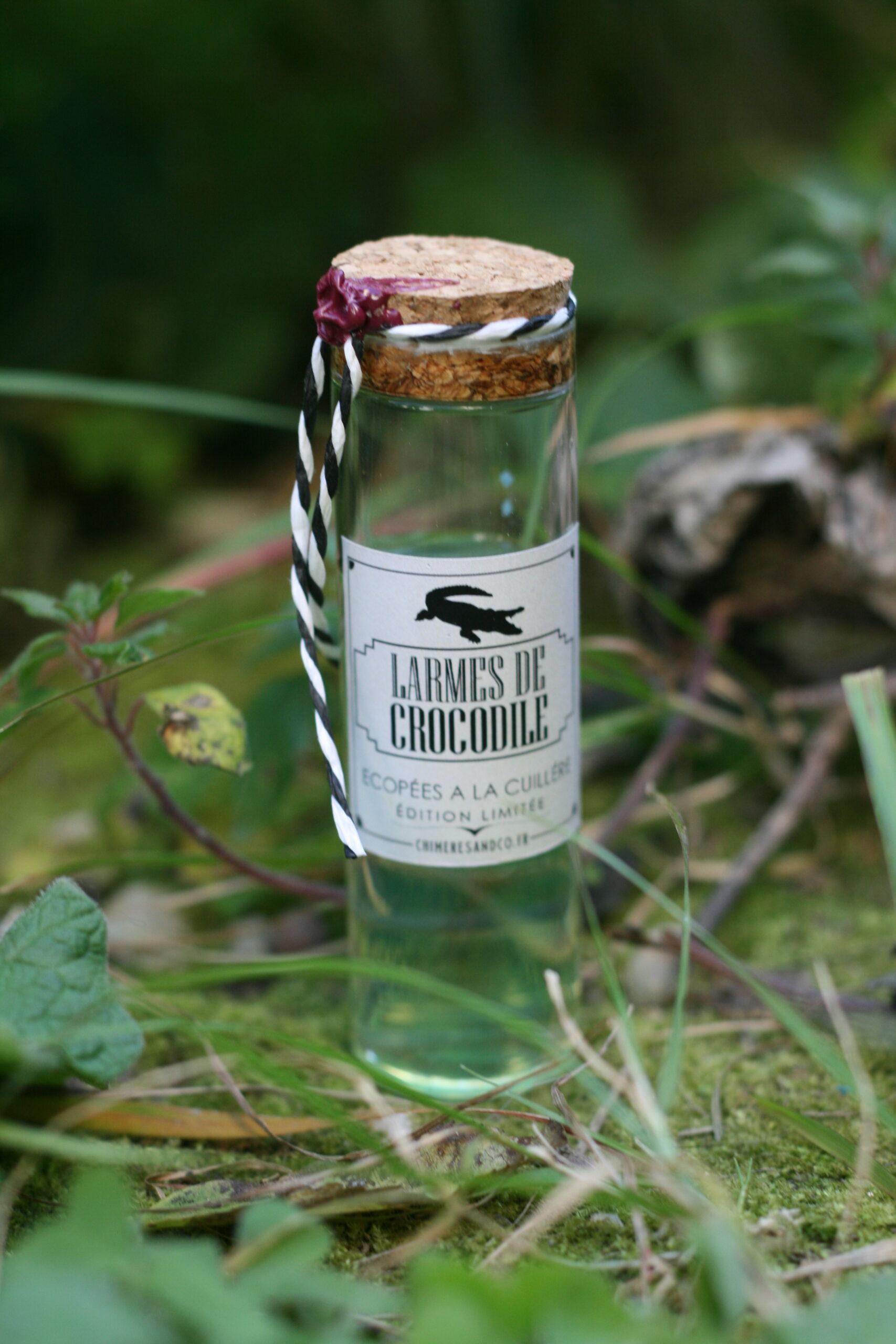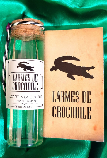 Nos larmes de crocodile, récoltées sur les berges du Nil, sont présentées dans une fiole en verre avec bouchon en liège, scellée à la cire Herbin, accompagnées de son livret explicatif détaillé sur la provenance et l’origine du contenu et présentées dans une boite kraft remplie de raphia.