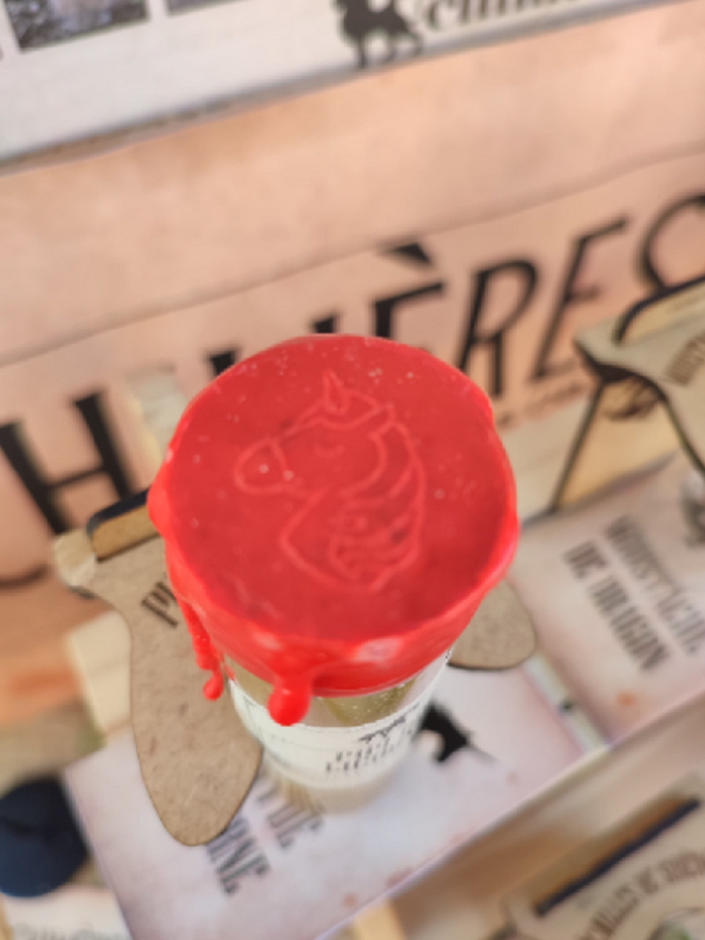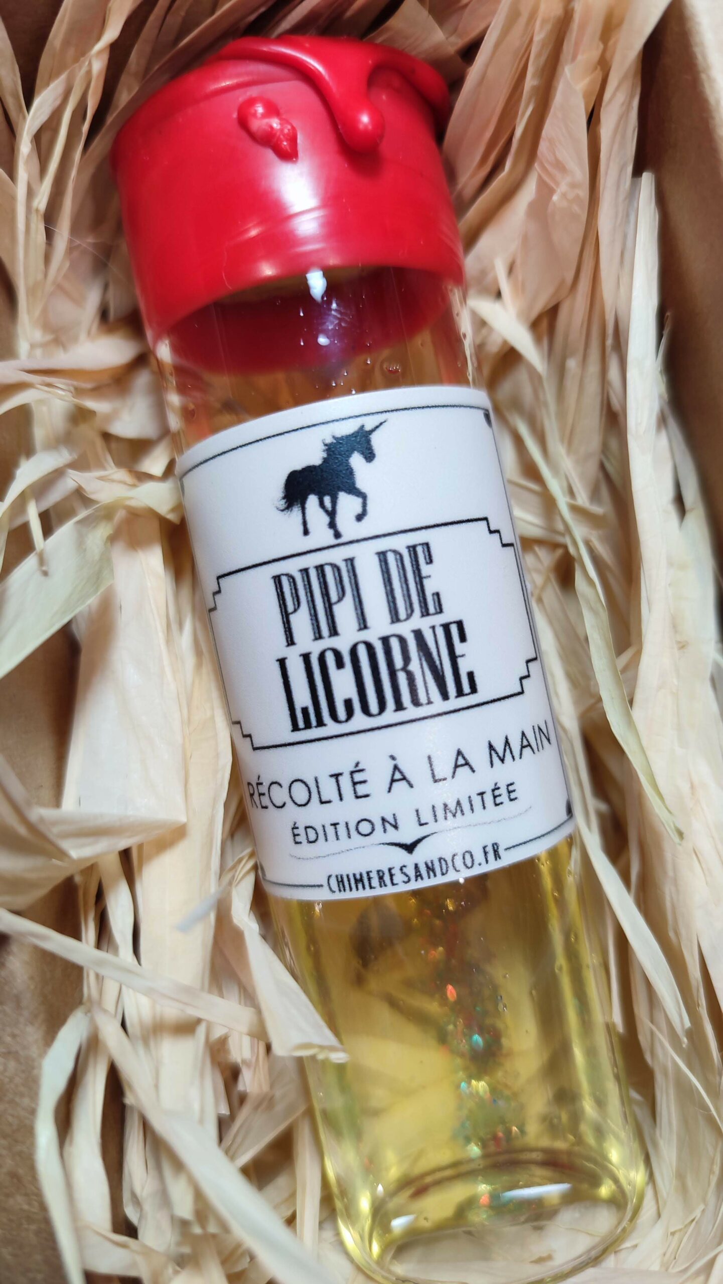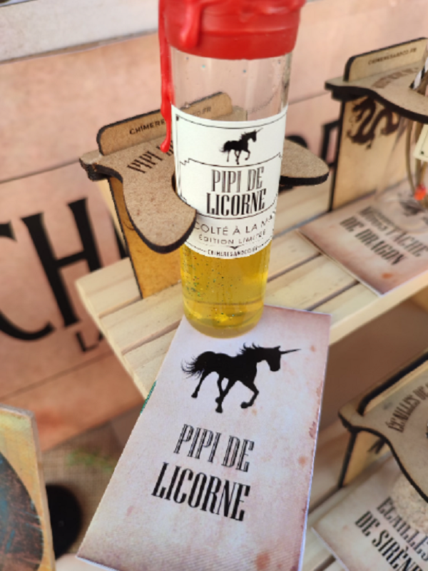 Notre pipi de licorne, récolté à la main, est présenté dans une fiole en verre avec bouchon en liège, scellée à la cire, accompagnées de son livret explicatif détaillé sur la provenance et l’origine du contenu et présentée dans une boite kraft remplie de raphia.