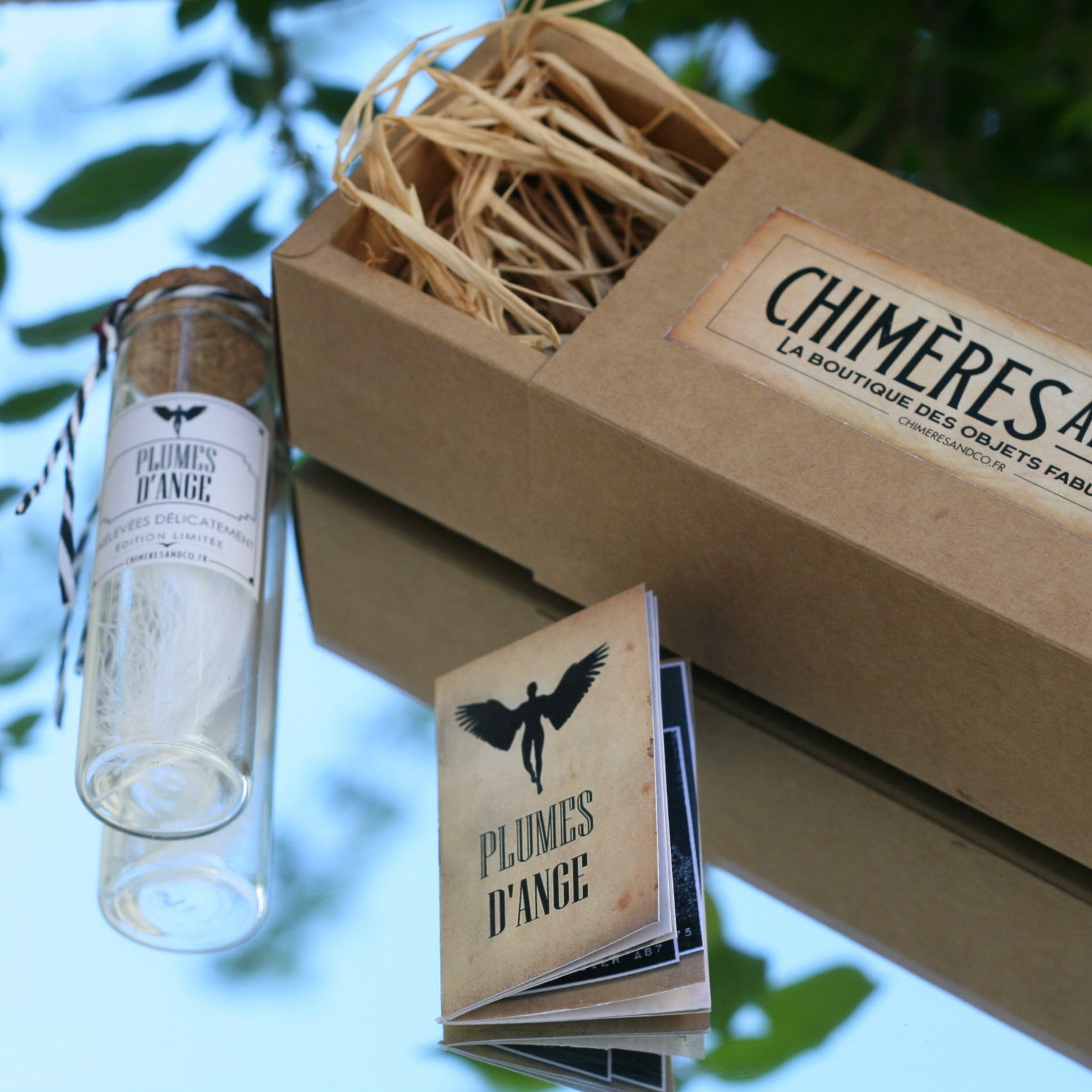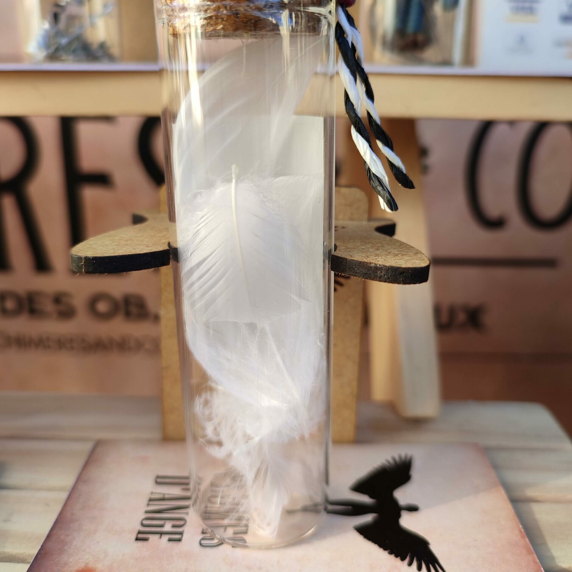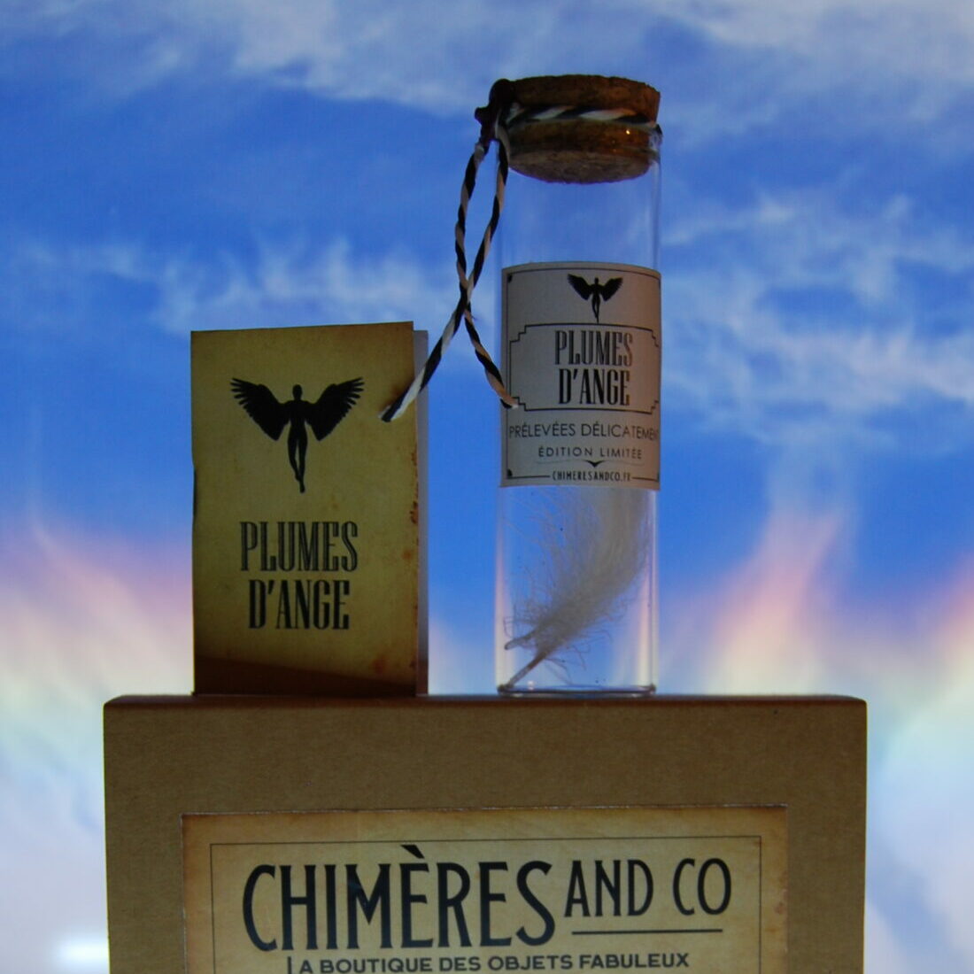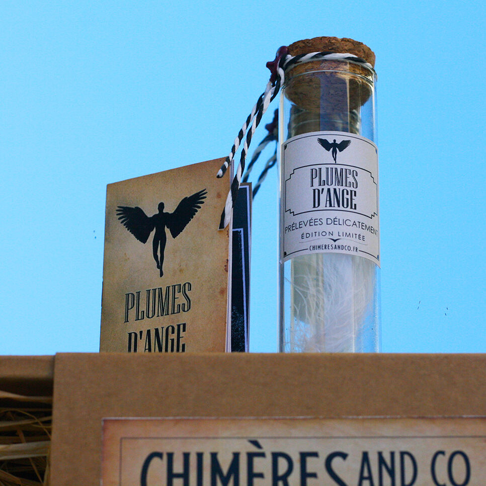 Nos plumes d’ange, prélevées délicatement, sont présentées dans une fiole en verre avec bouchon en liège, scellée à la cire Herbin, accompagnées de son livret explicatif détaillé sur la provenance et l’origine du contenu et présentées dans une boite kraft remplie de raphia.